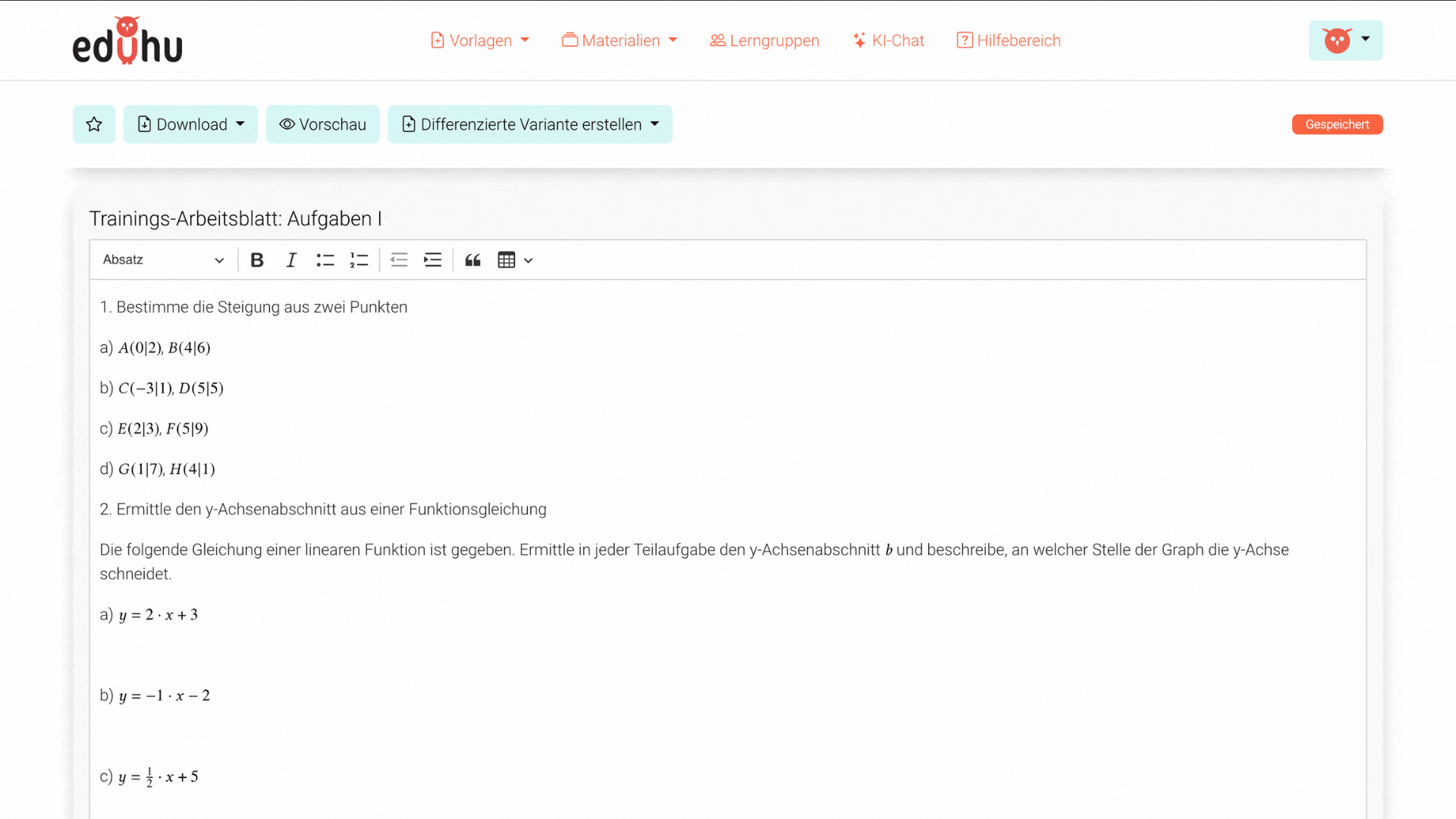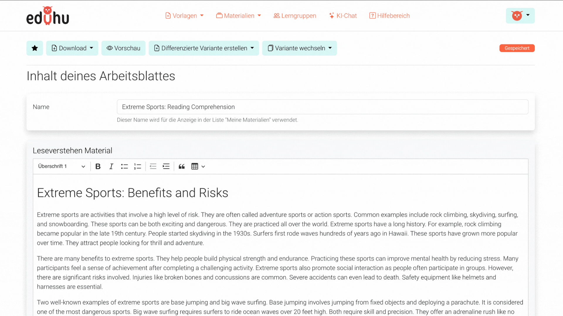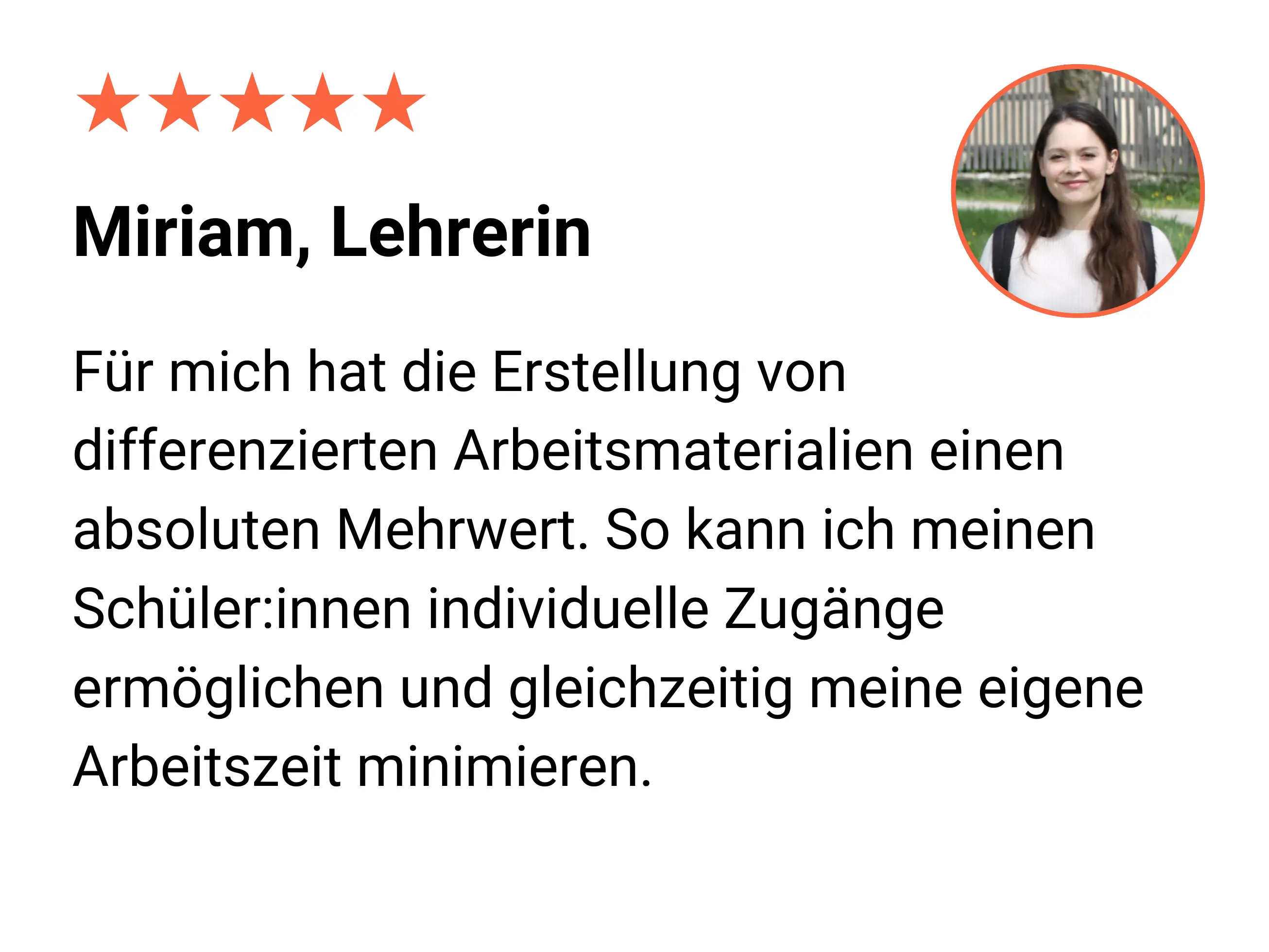 Egal, ob leichtere Sprache oder komplexere Zusatzaufgaben. Mit nur wenigen Klicks kannst du differenzierte Varianten deines Arbeitsblattes erstellen. Damit kannst du gezielt auf die Bedürfnisse deiner Lerngruppe eingehen - ohne immensen Mehraufwand.